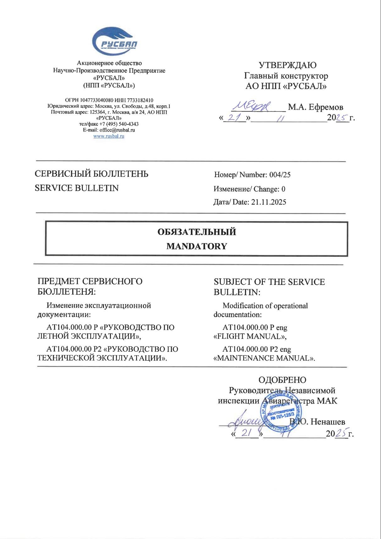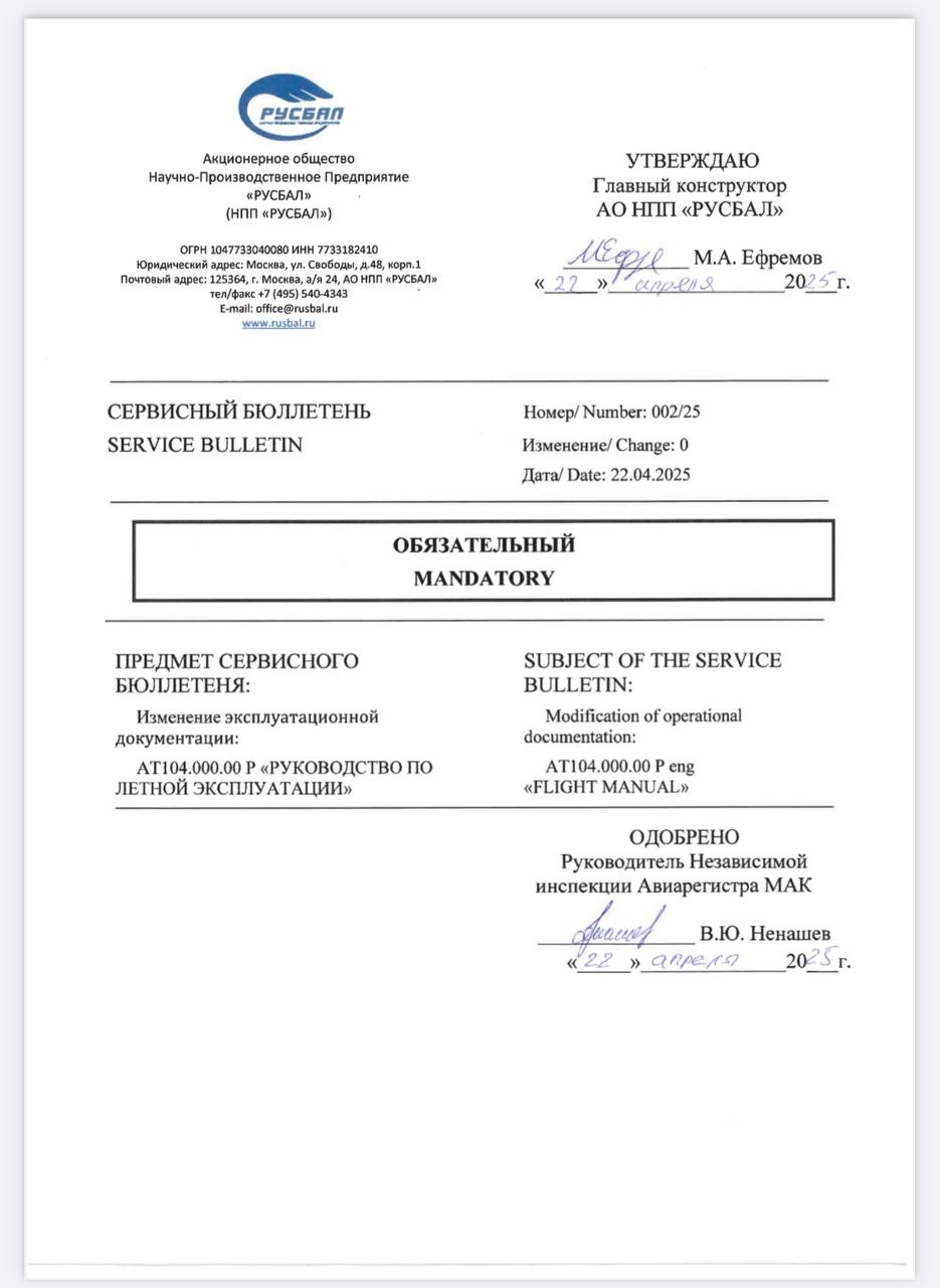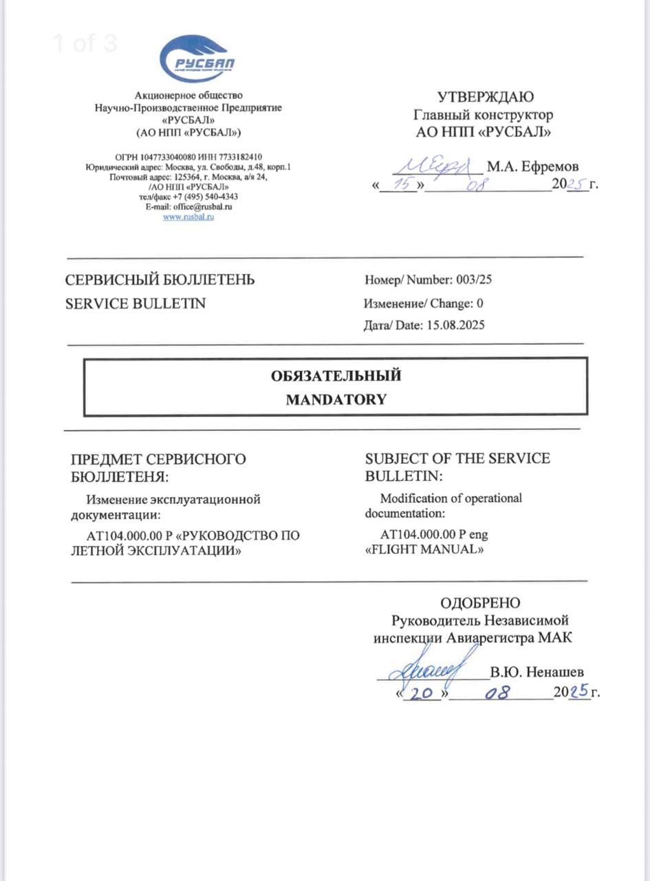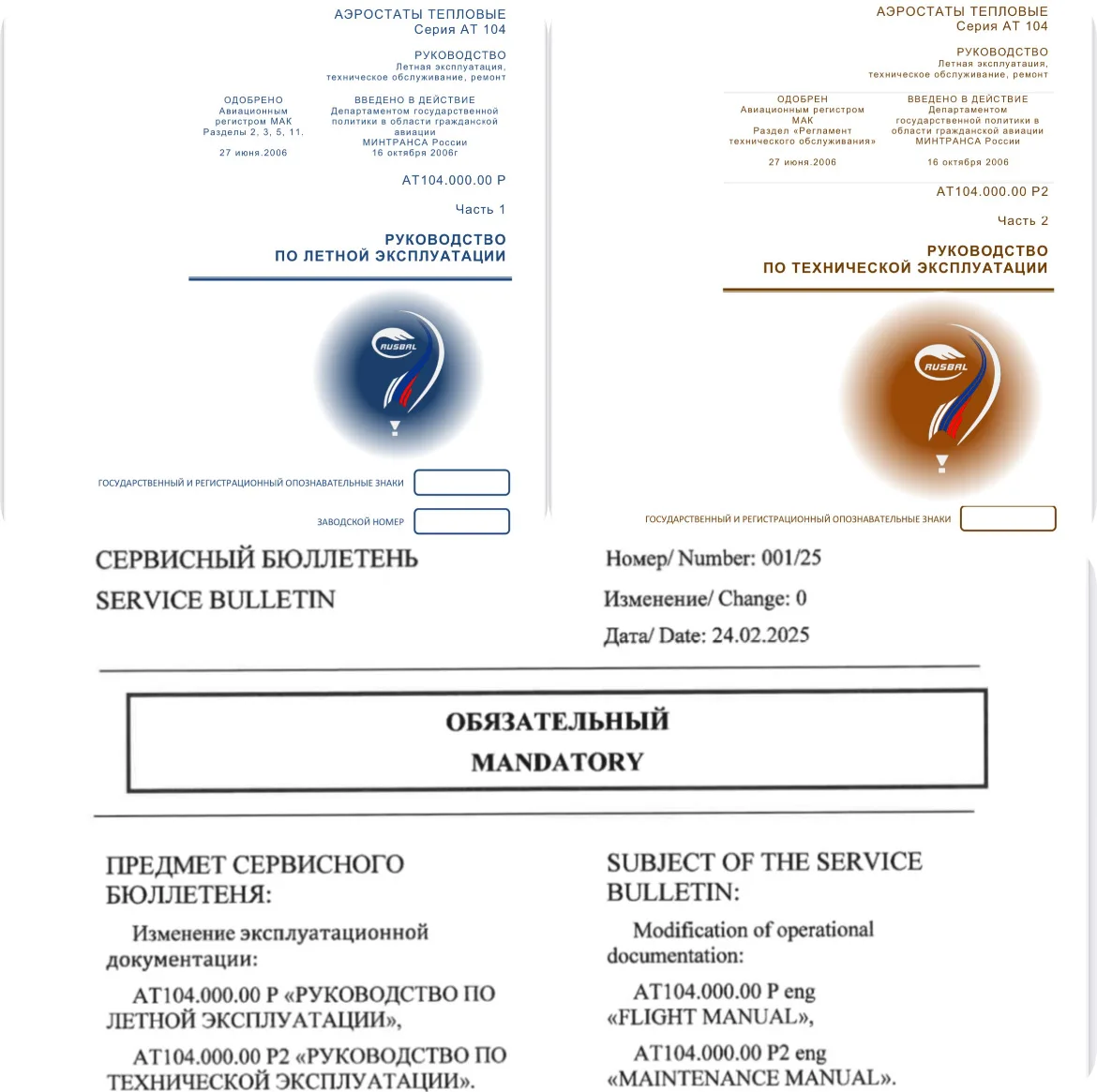 Changes to the operational documentation: "Flight manual" and "Maintenance manual"